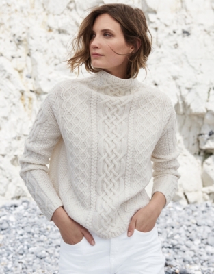Blending quality and tradition with the latest designs, this roll neck aran jumper has been knitted on the rugged atlantic coast of ireland using a traditional honeycomb and trellis knitting pattern.